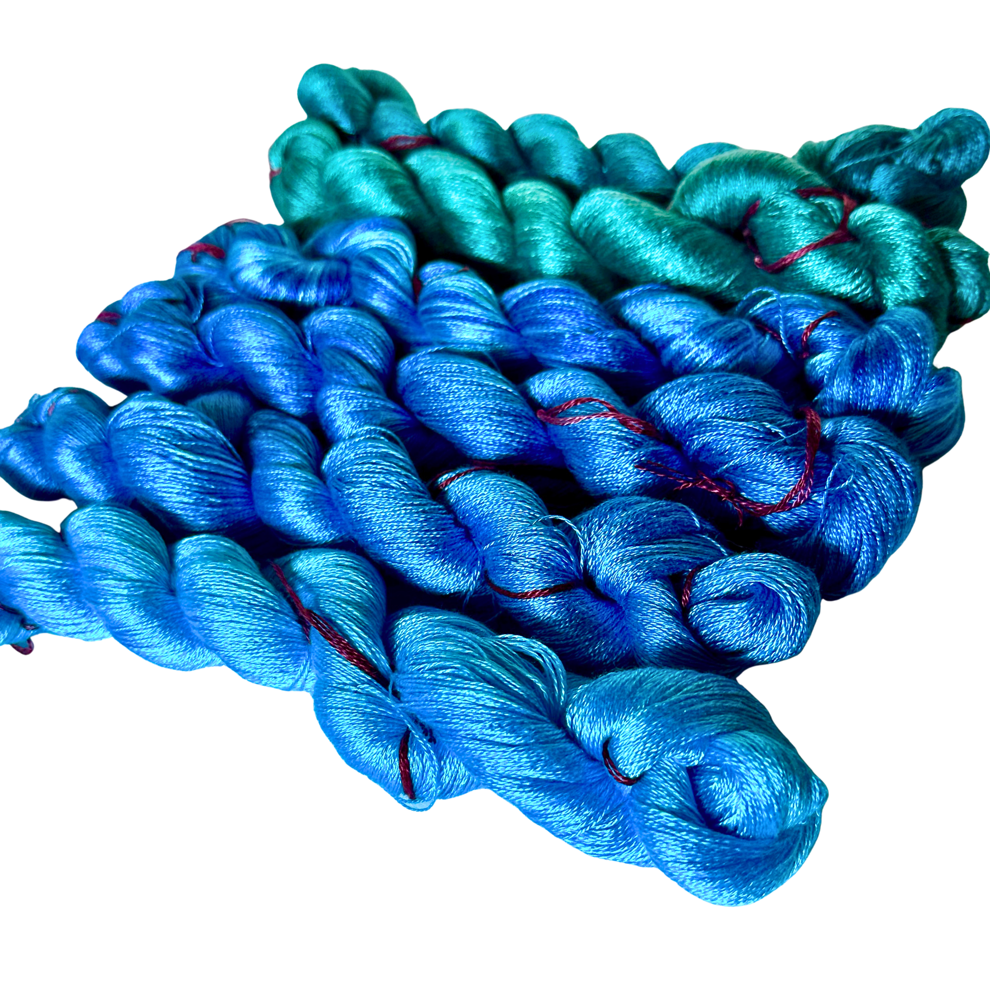 6 Skeins of certified 8/2 Tencel 500 yards each and 2 Skeins Organic Cotton 50 Yards each. These skeins are enough to make a 6 yard long warp to weave the Blue Morpho Butterfly inspired table runner as seen in Handwvoen Magazine Spring 2026!